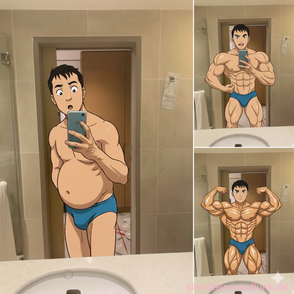 しかし1年経った時点で、見た目の変化がほとんど感じられないのがつまらなかったので、僕が過去にFacebookに投稿した「デブの状態(※お腹は少々わざと膨らませてはいます)」の写真を、AIを使ってムキムキにさせてみました(爆)